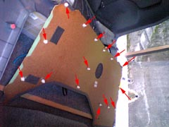 1)リアハッチドアの内側にあるグレー(緑円)のクリップを2カ所外します。