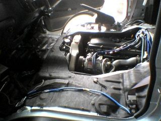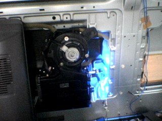 DIYによるリアヒーターコア裏側部分。妖しい光は[ネオン]点灯試験中。 |