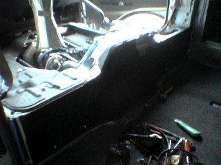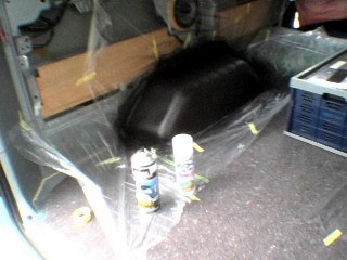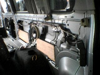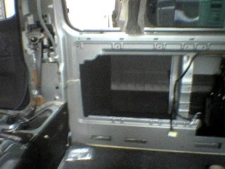 車内内貼を全部剥がした所です。右側下側に見えるコンパネはベッド固定用のものです。 |