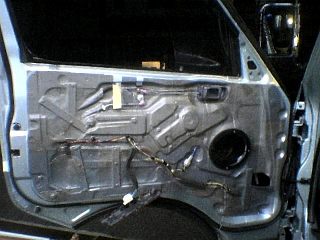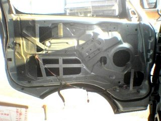 ドア・デッドニング作業途中。ドア中側は[大人シート]を全面貼付。開口部にはアルミ棒材をリベット止。 |