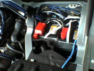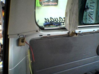 リア・アーシング全景(仮付状態)。ワイヤー5m使用(汗。手前に見えるのはデリカ純正ルームライト(笑 |