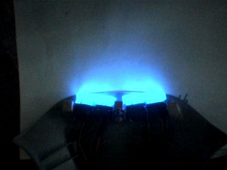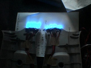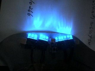 点灯試験。高輝度青色LEDは、そのままの状態だとかなり光に方向性が有ります。 |