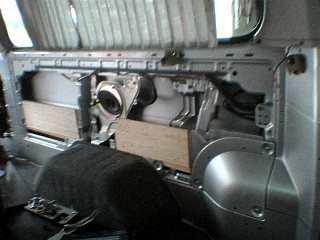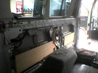 左リアスピーカー取付、ピラー取外状態。この広大なスペースは何かに使える? |