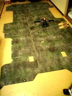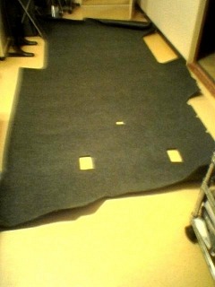 まずは採寸、右半分 遮音シートをカーペットの上に敷き込みます。 |